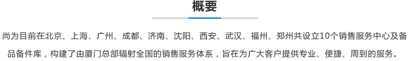 尚為目前在北京、上海、廣州、成都、濟(jì)南、沈陽、西安、武漢、福州、鄭州共設(shè)立10個(gè)銷售服務(wù)中心及備品備件庫,構(gòu)建了由廈門總部輻射全國的銷售服務(wù)體系,旨在為廣大客戶提供專業(yè)、便捷、周到的服務(wù)。