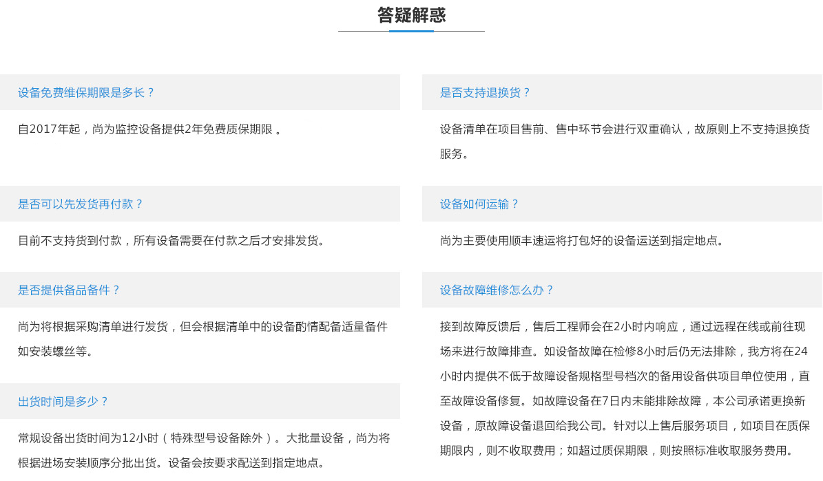設(shè)備清單在項(xiàng)目售前、售中環(huán)節(jié)會進(jìn)行雙重確認(rèn),故原則上不支持退換貨服務(wù)。